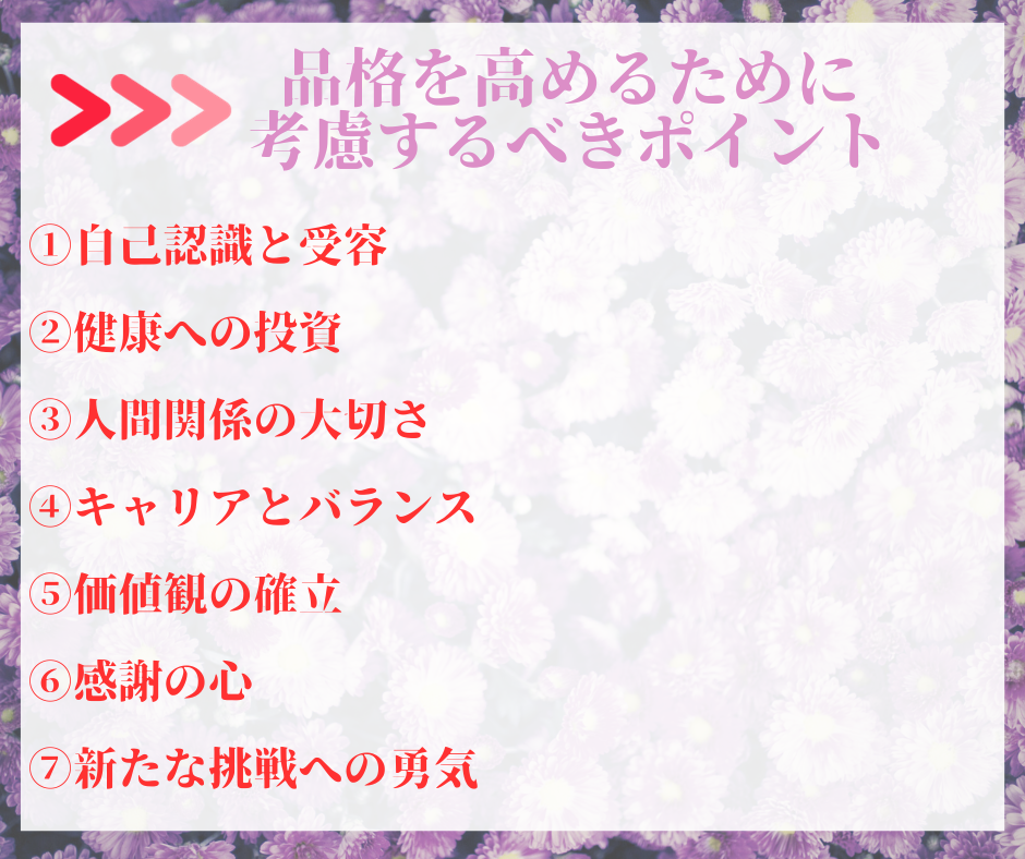 これらのポイントを考慮しながら、自分自身が充実感を感じ、他者と共により良い社会を築くために努力することが、アラフォーにとっての人生の品格を高める一環となるでしょう。